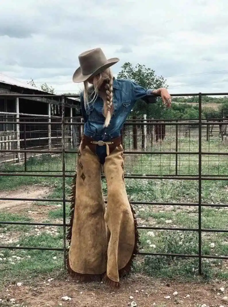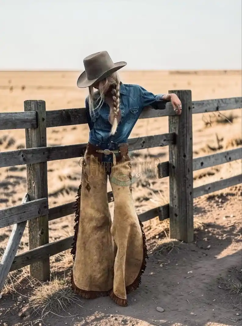 ↓ 40% Select OptionsSelect Options Women Women’s Brown Suede Western Chaps with Integrated Thigh Pocket and Fringe | The Hybrid Leather $ 300 Original price was: $ 300.$ 180Current price is: $ 180.