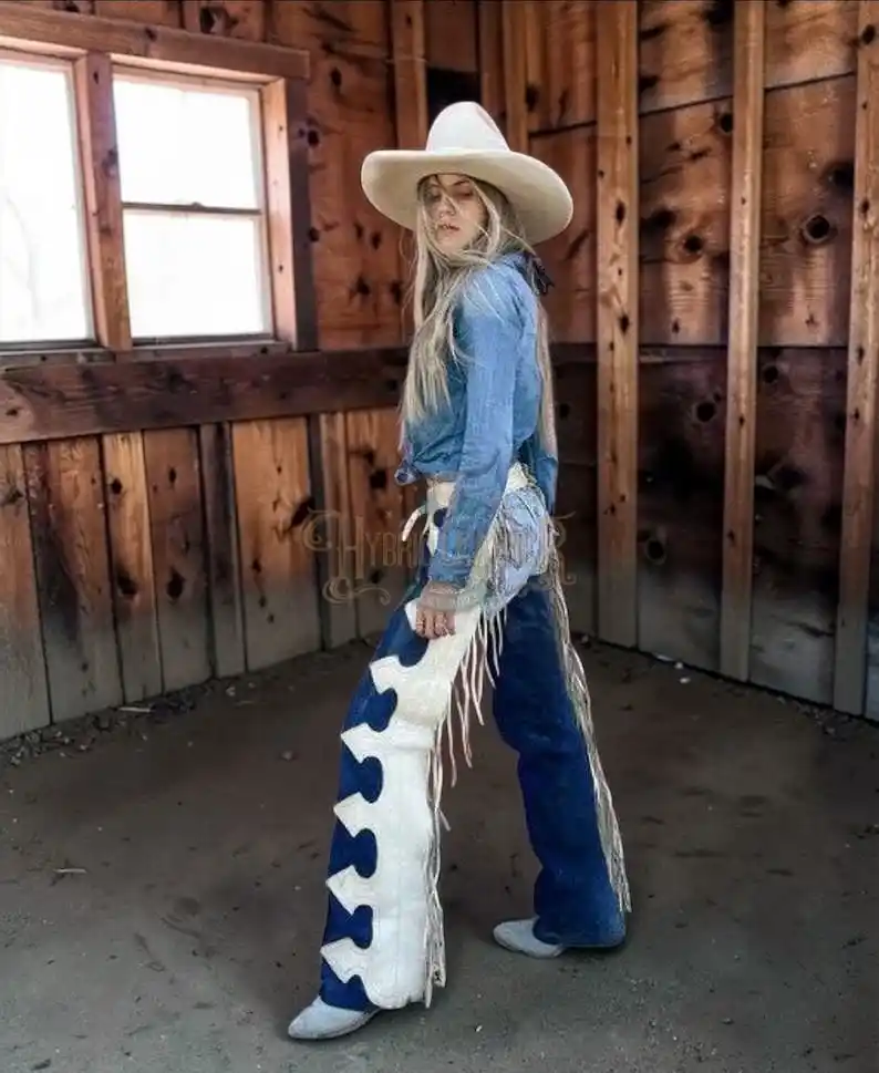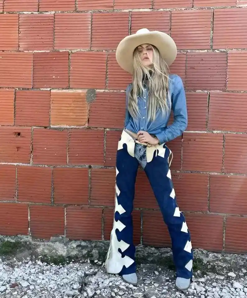 ↓ 40% Select OptionsSelect Options Women Women’s Navy Blue Western Chaps with White Leather Inlays and Scalloped Trim | The Hybrid Leather $ 300 Original price was: $ 300.$ 180Current price is: $ 180.