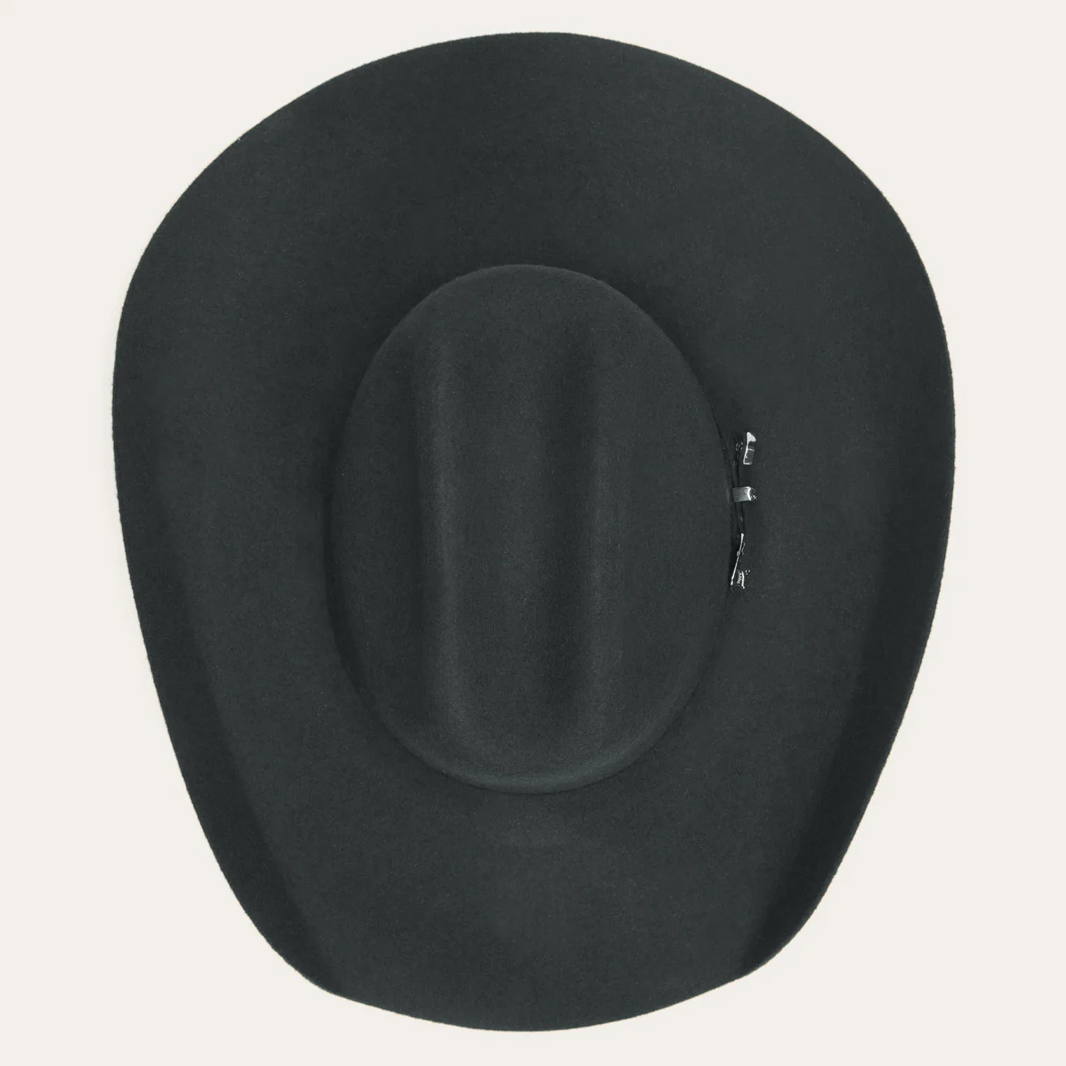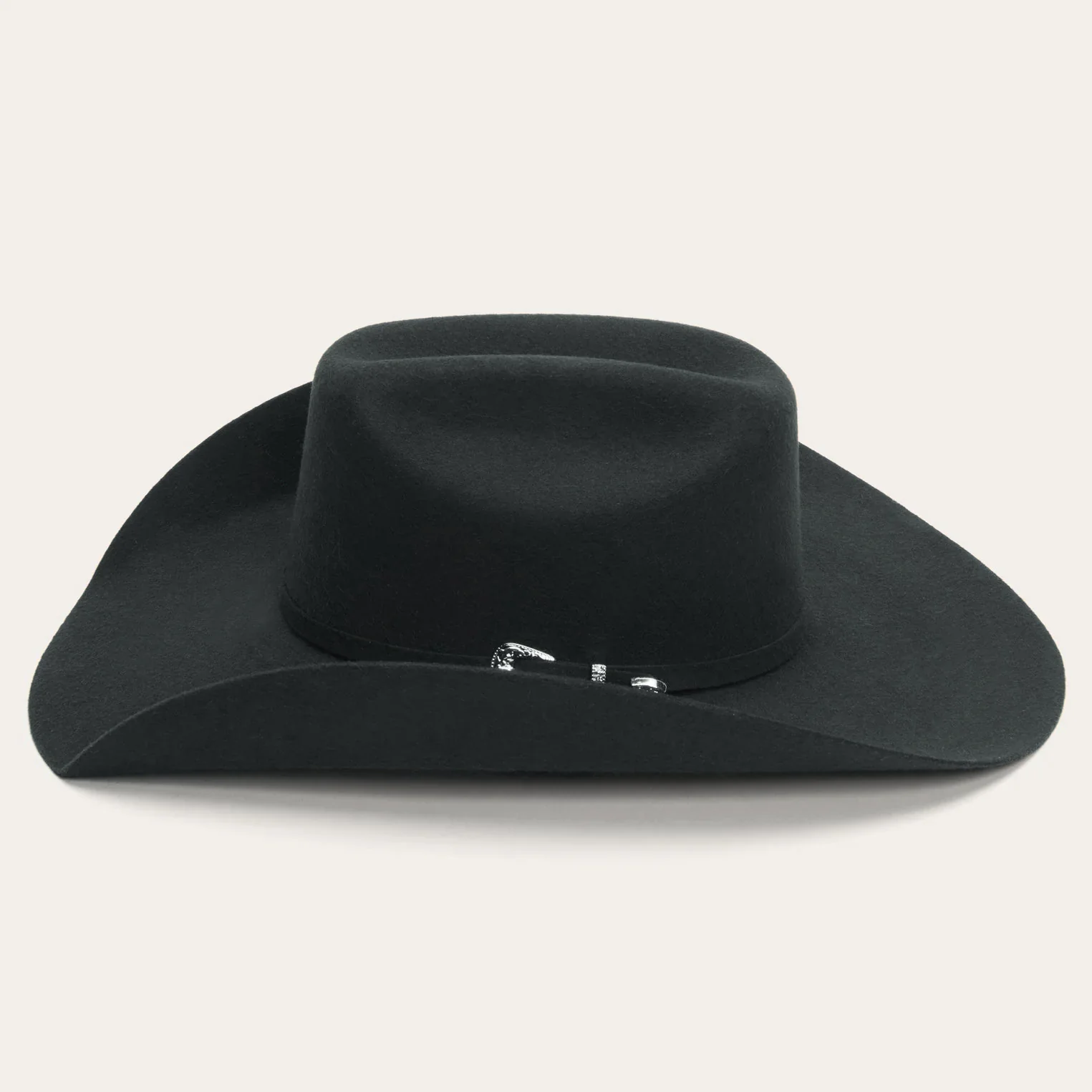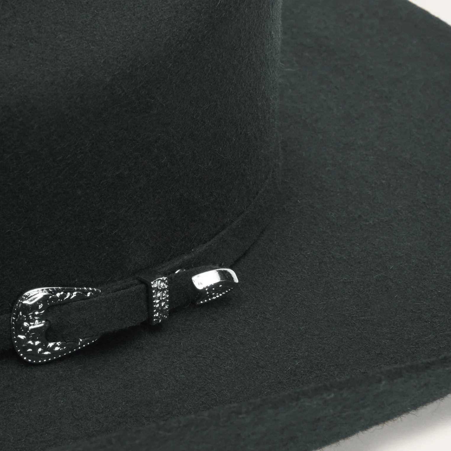 Classic kids’ black cowboy hat crafted in premium leather, featuring a wide brim and western buckle detail. Perfect for rodeo events, riding, or everyday western wear.