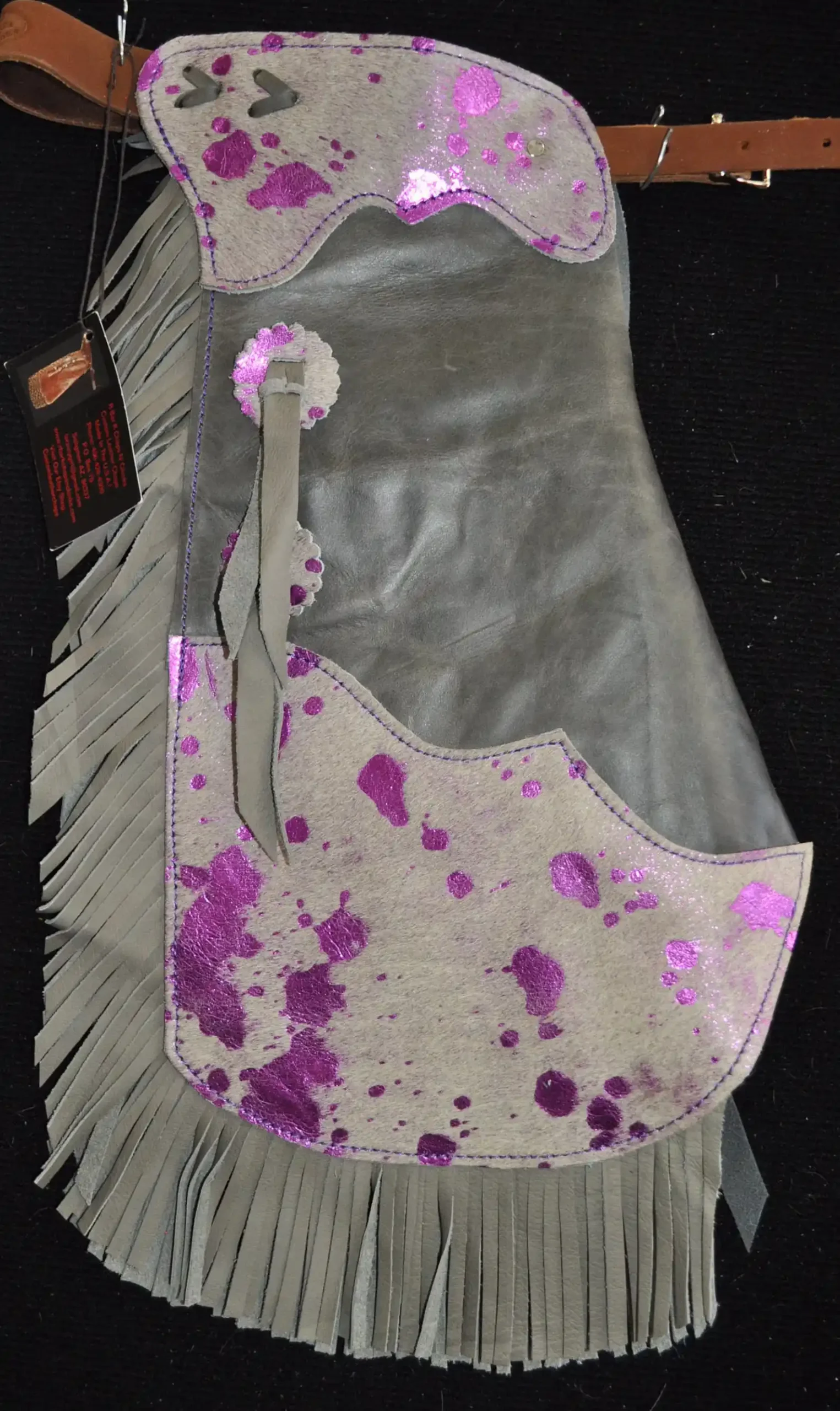 Durable kids’ leather chaps in grey with purple accents and fringe. Perfect for rodeo, horseback riding, and western wear.