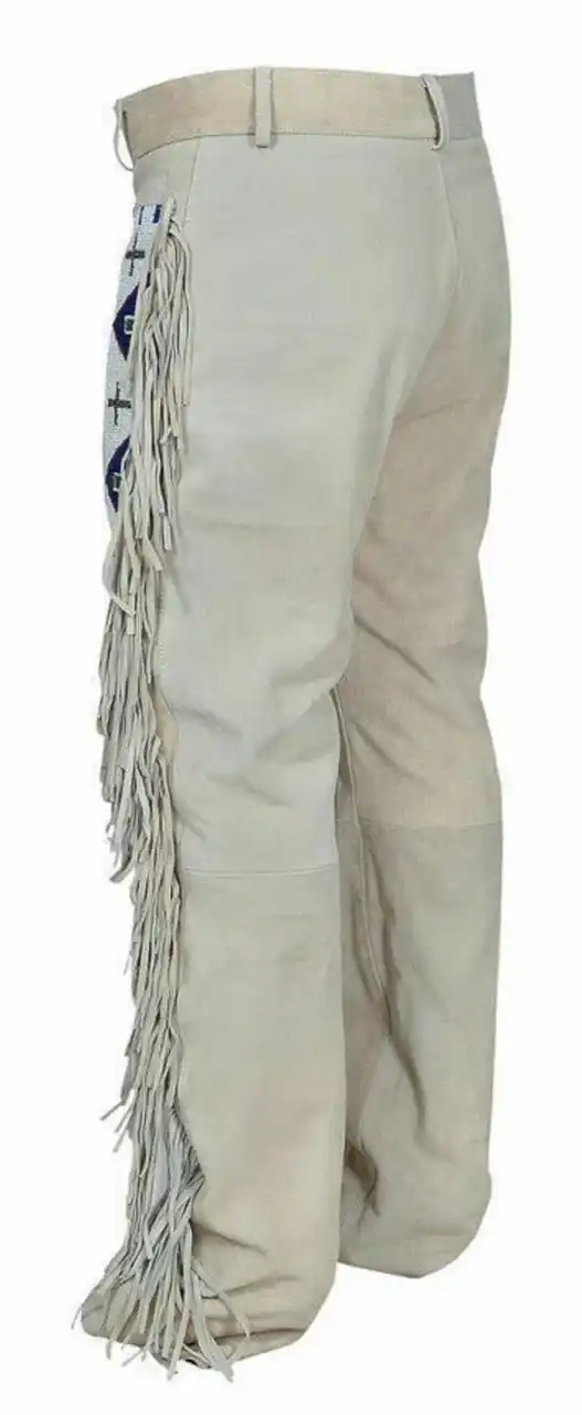 Handcrafted from genuine buckskin leather, these men’s Western pants feature side fringe and Native American-inspired beadwork. A rugged yet stylish choice for cowboys, riders, and re-enactments.