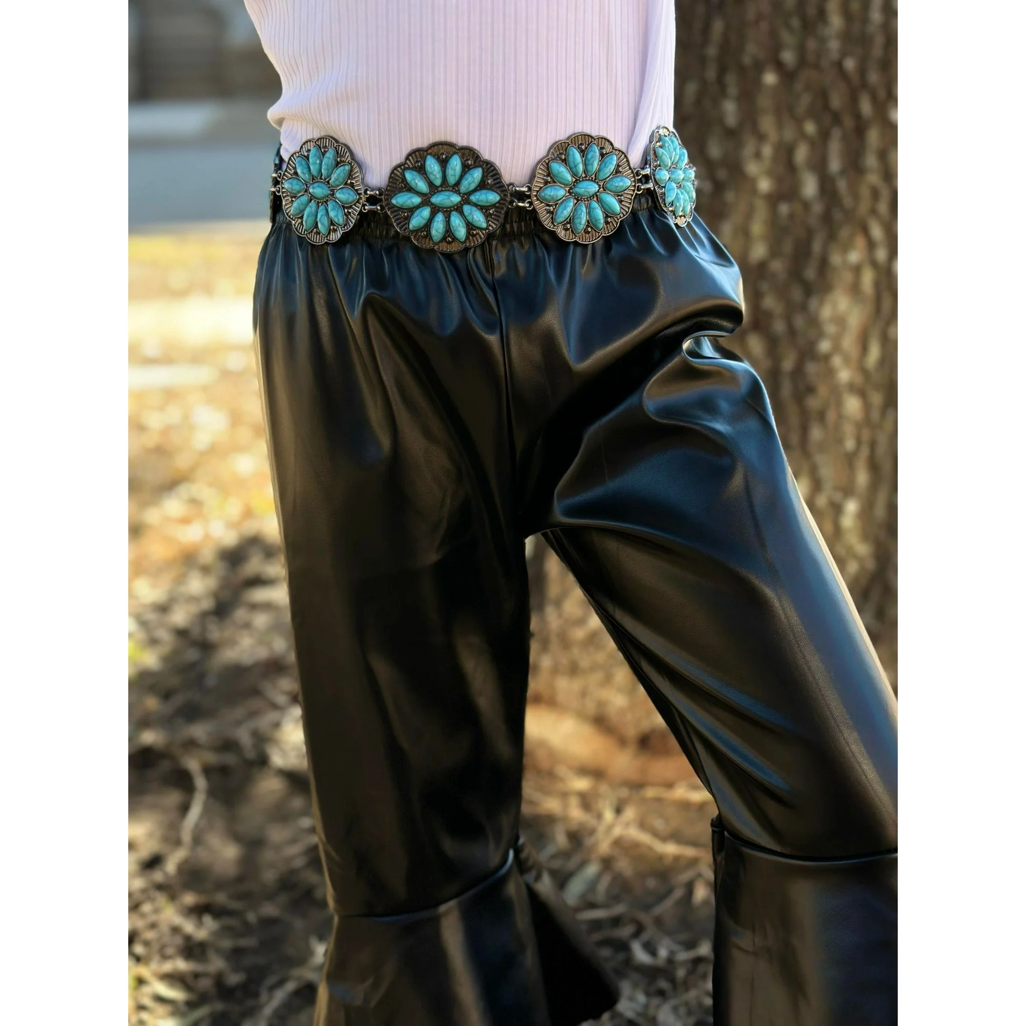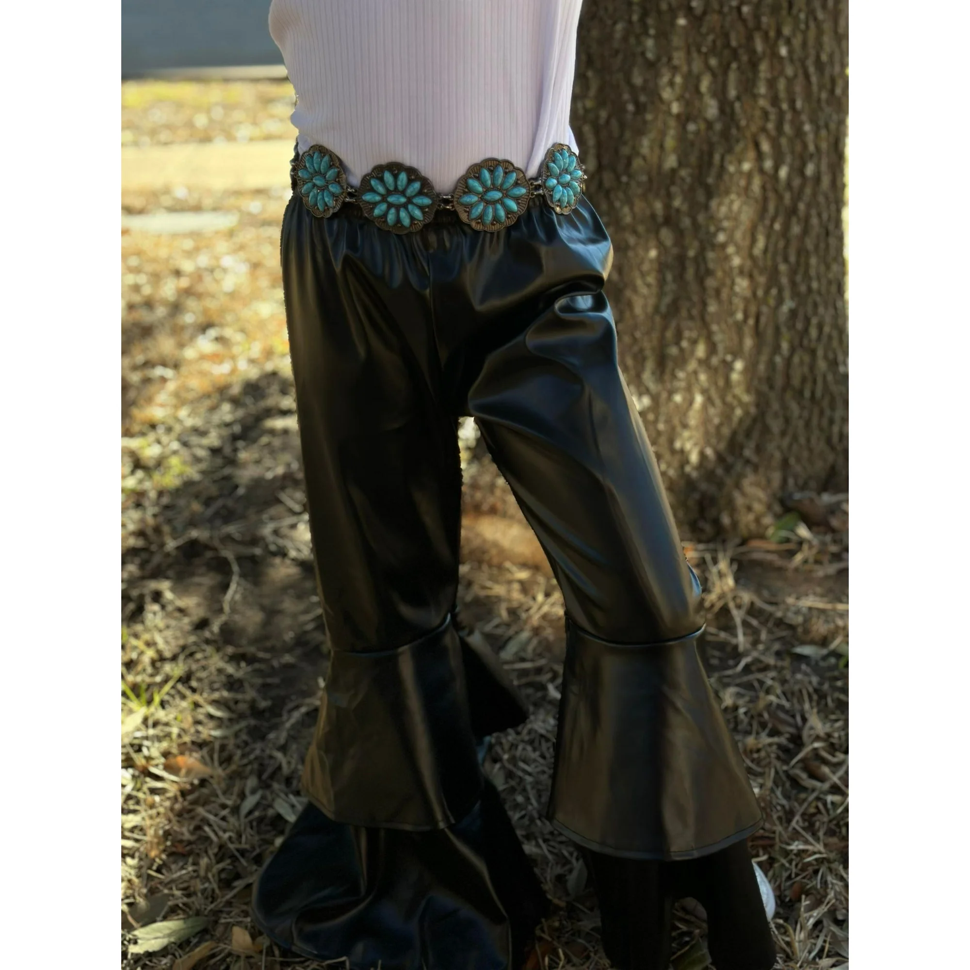Trendy kids’ black faux leather flared pants with a retro bell-bottom design. Perfect for adding bold style and comfort to your child’s everyday outfits.